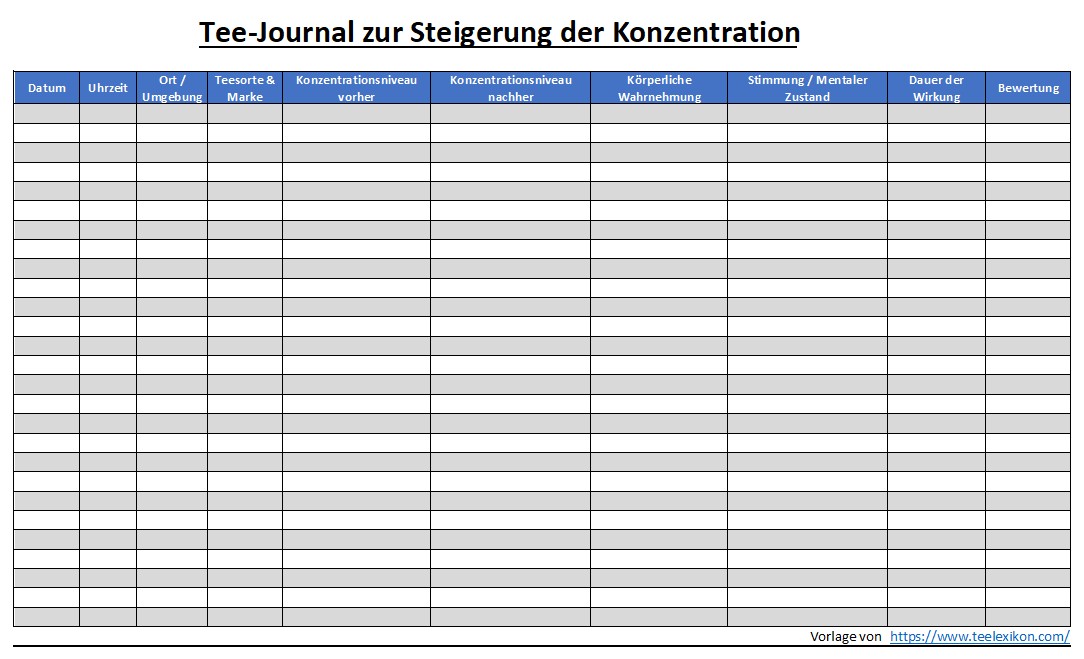 Doch welcher Tee wirkt nun für welche Zielgruppe am besten? Wie immer kommt es darauf an. Beispielsweise auf den eigenen Geschmack, auf die Tageszeit oder wie man selbst auf Koffein reagiert. Wer wirklich langfristig seine Konzentration mit Tee steigern bzw. besser mit Tee lernen möchte, dem empfehle ich verschiedene Teesorten auszuprobieren und die Wirkung zu protokollieren. Ebenfalls sollte man dabei ein paar Umgebungsvariablen mit aufnehmen, um so herauszufinden, mit welchem Tee man am besten die Konzentration steigert und das Gehirn fördert. Ich habe dir hierfür eine Beispielvorlage (PDF-Format) erstellt, die du für die eigene Auswertung nutzen oder auch ändern/ergänzen kannst.